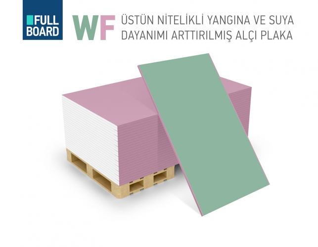 Üstün nitelikli YANGINA ve SUYA DAYANIMLI FULLBOARD plaka, yangına dayanımı arttırılmış, suyu itme özelliğine sahip, yüzeyi düzgün ve hafif bir alçı plakadır. Çelik yapılar, ıslak hacimler, bölme duvar, şaft duvarları, asma tavan v.b. uygulamalarda kullanılır. Her iki yüzü, plakaya esneklik ve yüksek dayanım sağlayan kırmızı ve yeşil renkli özel karton ile kaplıdır.